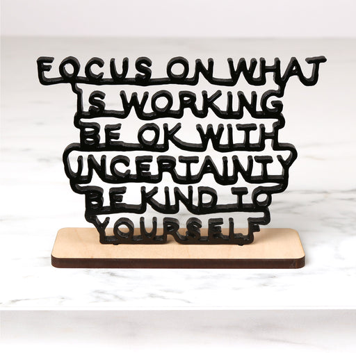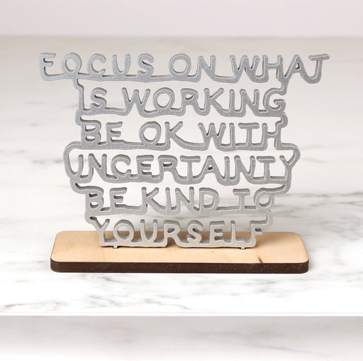 Words to live by! Focus on what is working.Be ok with uncertainty.Be kind to yourself. This freestanding sculpture is made of laser cut 1/4" wood ...